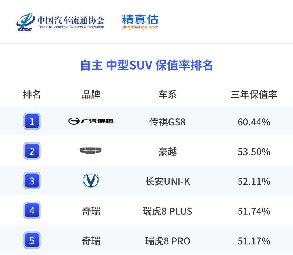销量高不代表价值稳,二手市场的认可才是真正的“试金石”。根据中国汽车流通协会与精真估联合发布的《2025年度中国汽车保值率报告》,广汽传祺荣获自主品牌三年保值率排名第一。其中,传祺GS8夺得自主中型SUV三年保值率第一,传祺M8夺得自主MPV三年保值率第一,传祺E8夺得自主插电混动MPV一年保值率第一。
