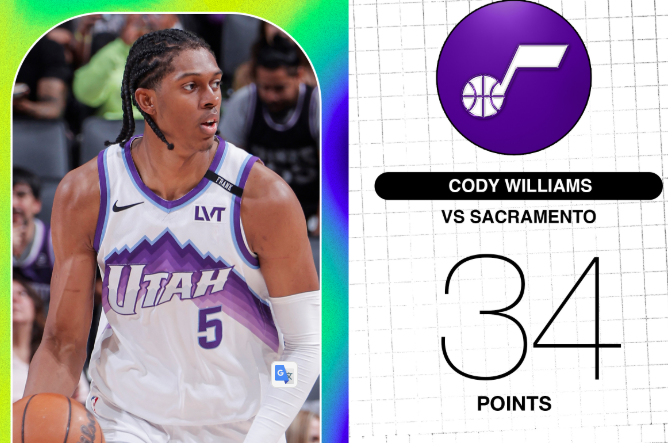 本场比赛,爵士球员科迪-威廉姆斯出战38分钟,20投12中,其中三分球7投3中,罚球8投7中,得到34分7篮板7助攻1抢断1封盖。